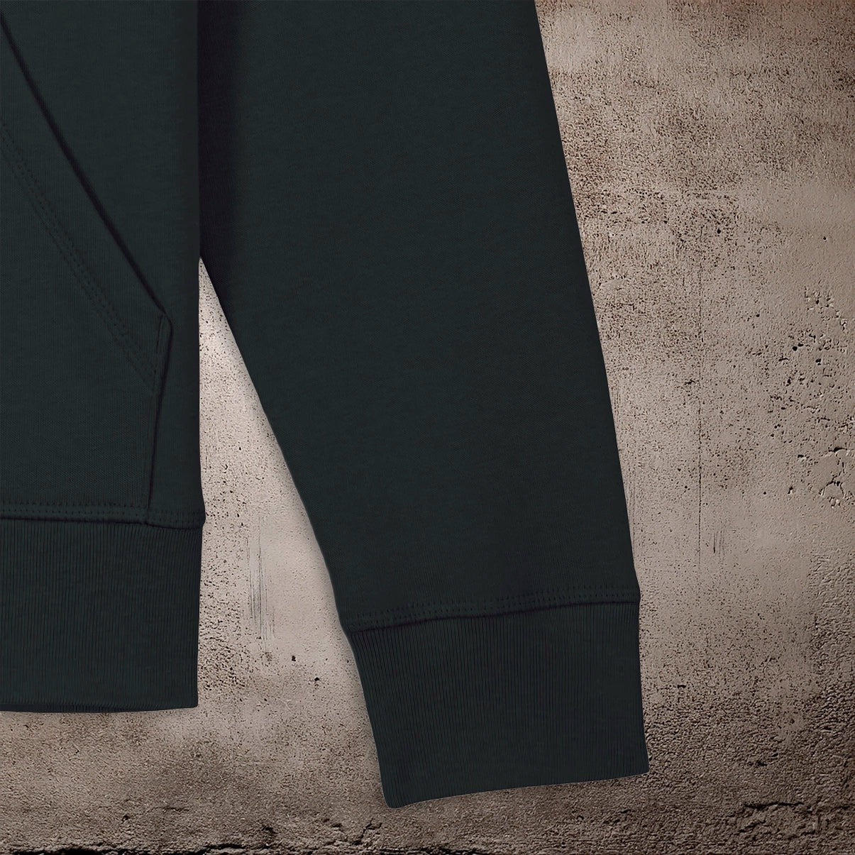 BHS ORGANIC COTTON UNISEX HOODIE WITH ELECTRIC EYE LOGO PRINT ON THE FRONT AND BACK. PRINTED WITH WHITE DISCHARGE INK ON BLACK GARMENT FOR SOFT FEEL.